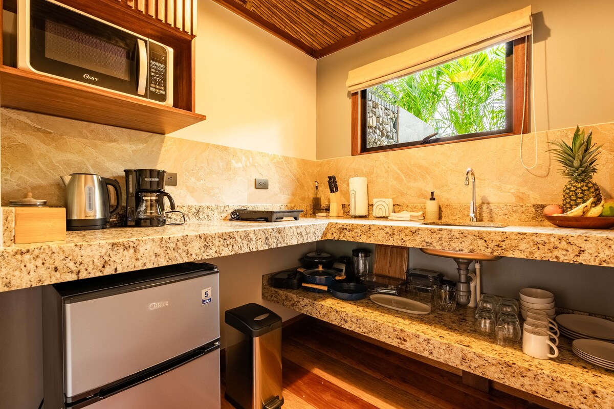 Atenció: potser no en voldràs marxar mai. Situada en una propietat privada de 4 hectàrees, aquesta cabana de muntanya exclusiva de bambú ofereix una privacitat total i un entorn natural extraordinari. Des d’aquí, gaudiràs de vistes panoràmiques impressionants que s’estenen per les muntanyes, les valls, les planes, els núvols que es desplacen i el golf de Nicoya. Les sortides i les postes de sol es desenvolupen en un paisatge de llum i color en constant canvi: una vista que realment defineix la frase «vista d’un milió de dòlars».