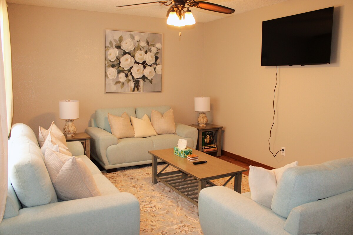 Aquest allotjament tranquil té espai per a tota la família. Amb 3 dormitoris, una sala d'estar, una cuina, un menjador i un bany, pots estirar-te. Gaudeix del temps que passeu junts a Garden City. Aquesta propietat té televisor! Et mudes o treballes a Garden City? Oferim un descompte del 10 % per setmana o un descompte del 25 % per mes. S’aplicaran automàticament en el moment de fer el pagament. A només 4 minuts en cotxe de l'Hospital GC A 3 minuts en cotxe d'Amtrak A 2 minuts en cotxe o a 5 minuts a peu del parc Frederick Finnup o del zoo Lee Richardson