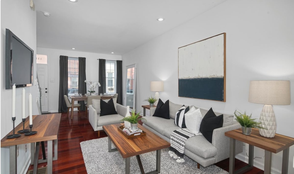 Et donem la benvinguda a la nostra impressionant casa de tres pisos al cor de Fishtown! Gaudeix de la comoditat moderna amb dormitoris espaiosos, maons a la vista i obres d'art úniques a tot arreu. Relaxa't a la sala d'estar a l'aire lliure amb cuina i televisor, perfecta per a les nits acollidores. A l'interior, gaudeix de les banyeres de luxe o cuina a la cuina totalment equipada. Els serveis per a famílies, com ara joguines i bressol, estan disponibles a petició. Gaudeix de tot l'encant de la vibrant cultura de Fishtown al costat de la teva porta!