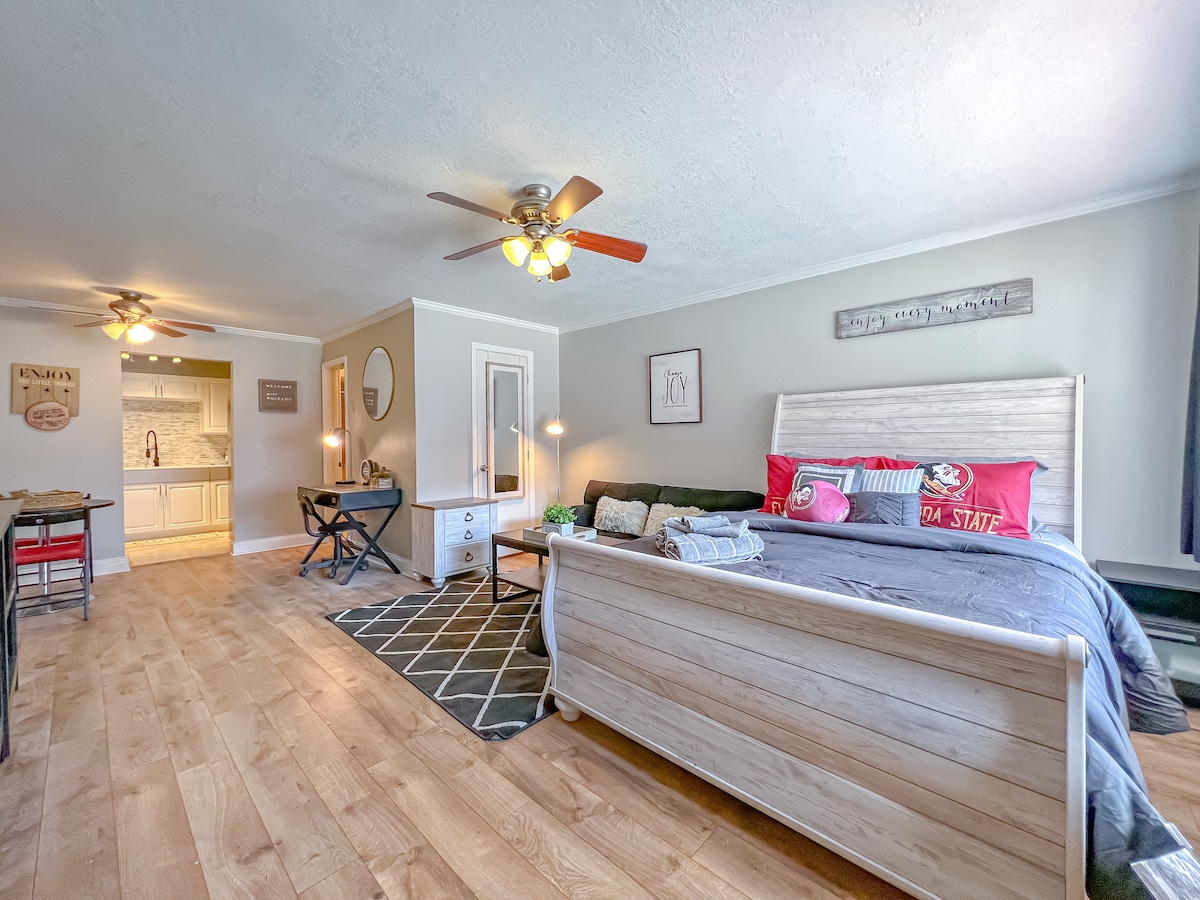 Estàs llogant aquest pis de luxe amb apartament king (tercer pis sense ascensor) al tranquil districte artístic del centre de Tallahassee. Aparca de forma gratuïta o a poca distància a peu del Capitoli, el Centre Cívic, l'Escola de Dret de la FSU, DOE, Gaines St, Parcs, College Town, l'estadi de la FSU, les cascades, la bona/informal menjador/oci nocturn. El mestre gaudeix d'unes postes de sol impressionants d'aquest complex d'usos múltiples d'arquitectura europea. Cuina totalment equipada, wifi, Keurig, bugaderia, 2 televisors. Sofà seccional amb capacitat per a 2 persones. Els caps de setmana de jocs requereixen un mínim de 2 nits.