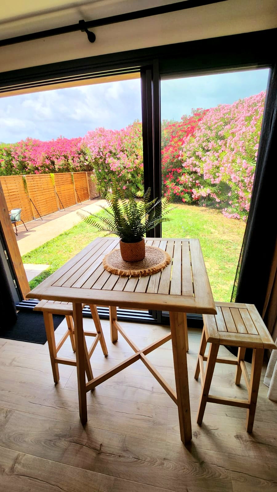 Et donem la benvinguda al nostre nou allotjament amb aire condicionat, situat al cor d'un jardí privat tancat i envoltat d'oleandres. Gaudeix d'un espai modern i acollidor per a dues persones, a 3 minuts en cotxe de la platja i de tots els serveis: supermercat, farmàcia, restaurants. A la teva disposició, la cuina està equipada amb vitroceràmica, microones, nevera, rentadora, cafetera exprés i bullidor. TV de pantalla gran, bany de luxe i dutxa 90X120, assecador de cabells, jocs, gandules, taula i butaques a l'aire lliure