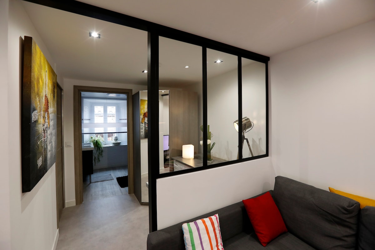 Estudi lluminós completament reformat! ☀️ Allotjament a prop de l'estació de tren, a prop del hiper centre i de tots els serveis. Edifici amb ascensor, tranquil, recentment reformat i totalment segur. Totalment equipat: llit «queen size», rentadora, rentaplats, cafetera, forn, bullidor, torradora, assecador de cabells, planxa, ...