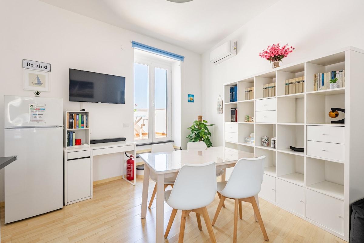Pis vintage al centre històric de Forio, gran, moblat amb estil i amb una terrassa des de la qual gaudir tant de les vistes al mar com de la muntanya Epomeo. A pocs passos del port (220m) i de la platja de Chiaia (700m), l'apartament es troba en una posició estratègica per passar unes vacances relaxants i còmodes. Mirant directament al carrer peatonal que porta a la Basílica de Santa Maria di Loreto, et trobaràs immers en restaurants, botigues, supermercats, bars i tot tipus de serveis.