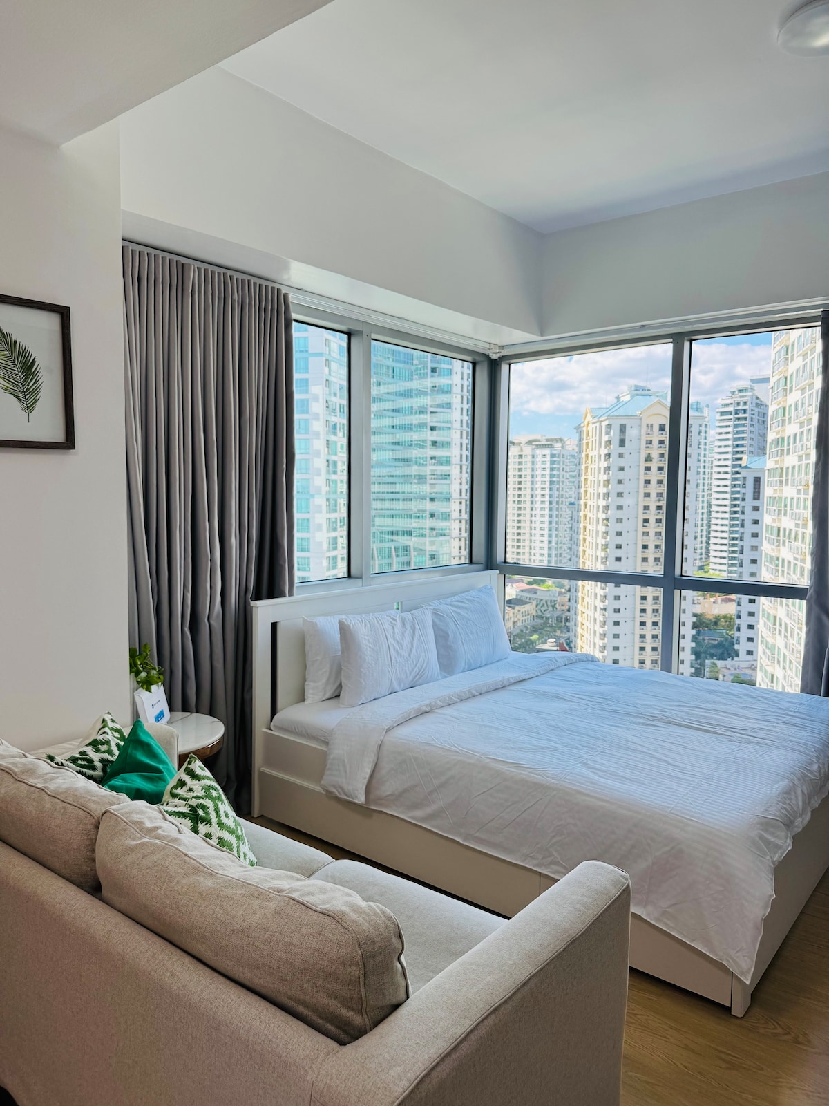 Feel stylish and experience the BGC vibe at this centrally-located place. Get direct access to Uptown Mall. This place is also just across the newly opened Mitsukoshi Mall. Our newly renovated place is bright and airy with a fantastic view of the Uptown Mall fountain show. Take an easy stroll as all major points of interests are just a few mins walk. Feel the energy of Uptown BGC. Shop, dine, or just have a relaxing break at the corner cafe. Come feel the energy of this vibrant community!