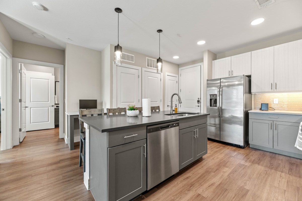 Allotja't en un allotjament modern d'1 habitació a pocs minuts del centre de Fort Worth, amb una llar de foc elèctrica acollidora, balcó privat i accés a una terrassa al terrat amb vistes a l'horitzó, una foguera, un gimnàs i zones d'estar. Gaudeix d'un espai ampli amb una cuina completa, wifi ràpida, dos televisors QLED 4K de 55 polzades, rentadora i assecadora a l'allotjament i un llit de matrimoni còmode. Inclou pica doble, vestidor i una dutxa de vidre elegant. Ideal per a negocis o per a lleure, a prop de Sundance Square, de restaurants i d'ofertes d'oci nocturn.