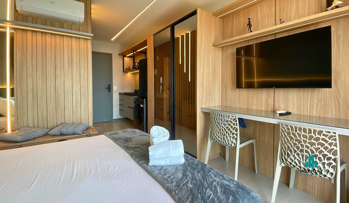 Estudi decorat amb un alt nivell i dissenyat per a estades curtes o llargues. Ideal per a parelles o viatgers solitaris, sigui per a oci o per a feina. Té capacitat per a 2 persones amb totes les comoditats necessàries. Situat a només 600 metres del passeig marítim, en un carrer tranquil i tranquil. Tot a prop: mercats, farmàcies, cafeteries i restaurants a 10 minuts amb cotxe. Gaudeix de la millor relació qualitat-preu per allotjar-te a prop d'un dels fronts marítims més bonics del Brasil, amb fàcil accés a les zones principals de la ciutat.