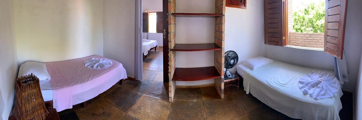 Suíte triplo fica no primeiro andar. É privativa com uma cama de casal tamanho padrão, uma cama de solteiro, ar condicionado, ventilador, smart tv com Prime video liberado, frigobar, banheiro com chuveiro elétrico e duchinha higiênica. Ambiente tranquilo ideal pra quem quer relaxar e ficar pertinho de tudo. A cozinha disponível facilita muito pra quem busca economia, além disso, oferecemos água mineral sem custo adicional.