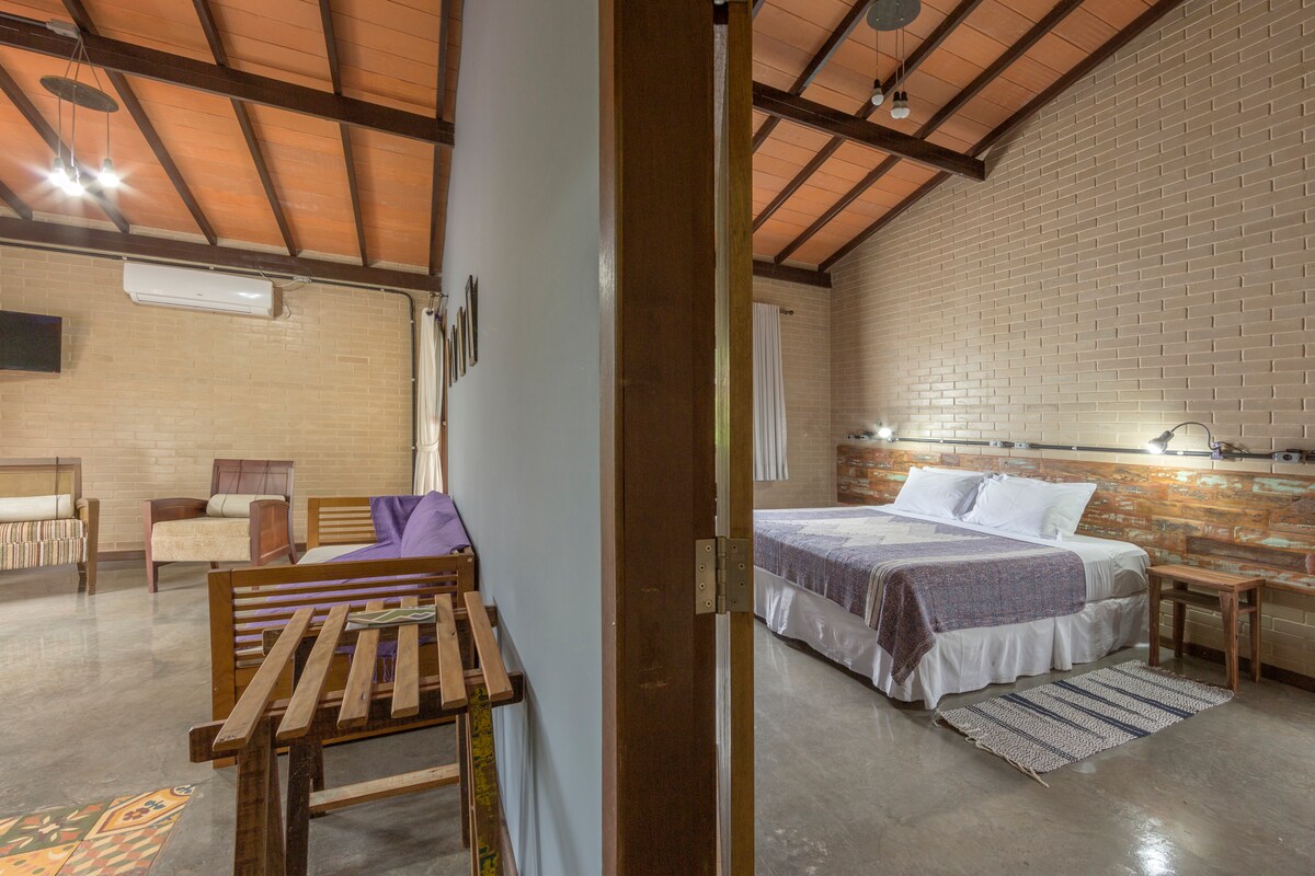 Hi ha tres xalets molt acollidors (Peace, Joy i Love), tots dos en mamposteria, molt grans i privats, amb bany privat, minibar, aire condicionat i un llit «queen size», que és opcional afegir tres llits individuals*. * Acceptem dos hostes per xalet. Si hi ha un tercer hoste, se't cobrarà 75 R$ per persona. Nens fins a 10 anys sense càrrec.