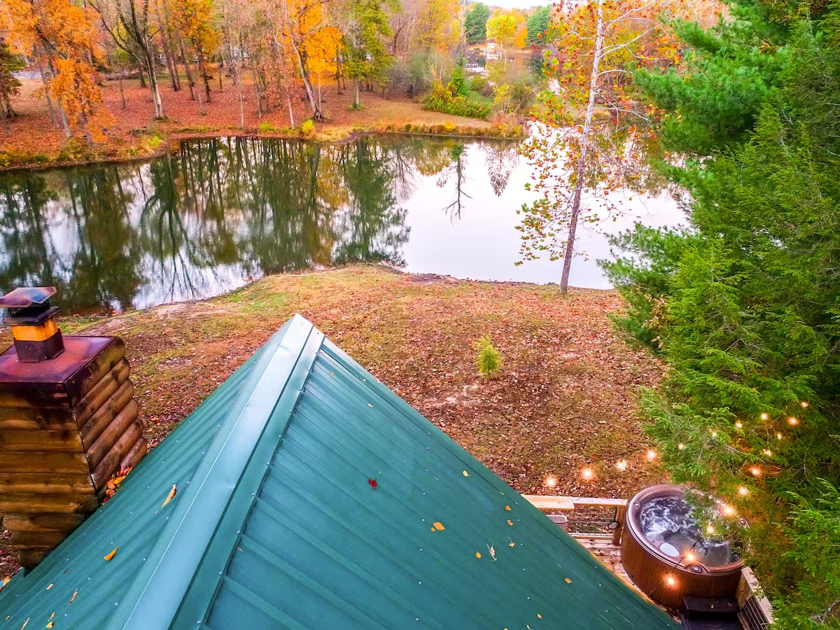 Cabana de fusta + casa d'hostes en un estany amb banyera d'hidromassatge
