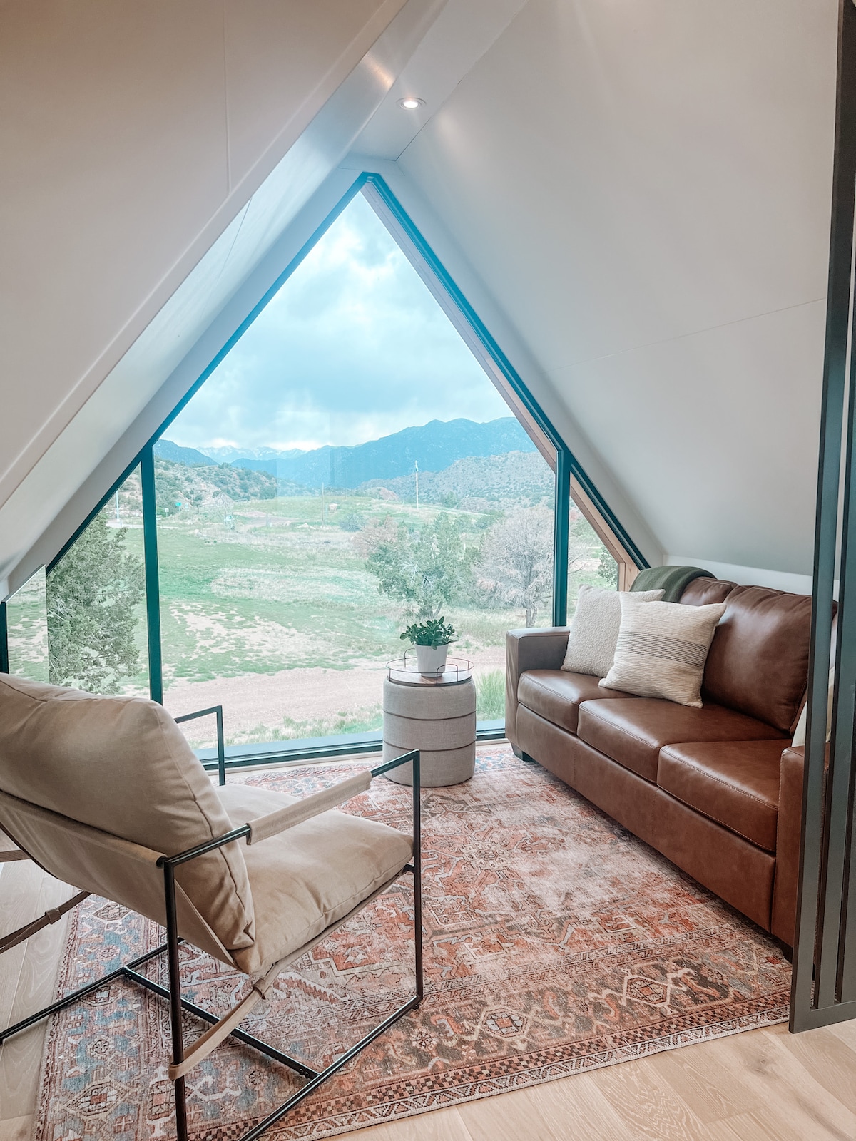 The Peakview Cabin mira cap a l'oest, i ofereix telons de fons de muntanya i escenes de pins i ginebres autòctons per gaudir-ne. Relaxa't a la nit al costat de la foguera de propà a la teva zona exterior personal a les cadires Adirondack. La caseta triangular disposa d'una sala d'estar acollidora, una cuina americana, un dormitori i bany privat i dutxa. Amb un llit queen al dormitori i un sofà llit de matrimoni a la sala d'estar, recomanem la caseta Peakview per a un màxim de 2 adults i 2 nens.