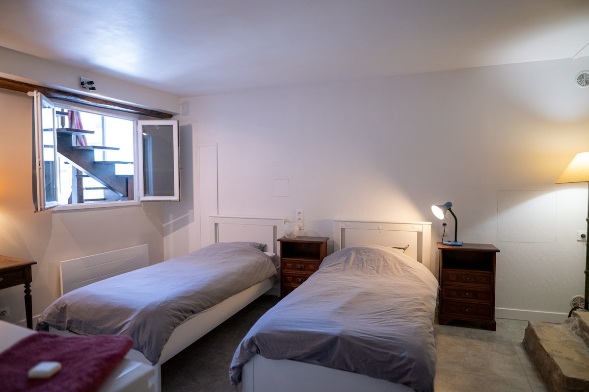 Allotjament de dues habitacions en un edifici annex al pati, amb encant de pedra, totalment equipat (TV, RMC Sport, wifi, electrodomèstics...). A 15 minuts de l'aeroport Roissy CDG, a 20 minuts de Asterix Park en cotxe. A 14 minuts en cotxe del Centre d'Exposicions de Villepinte. A 20 minuts de l'estació de tren RER D a peu (a 30 minuts de París). Al cor del poble històric amb tots els serveis (restaurant, botiga de queviures, tabac, carnisseria, museu ArcHEA...). Tranquil·litat garantida.
