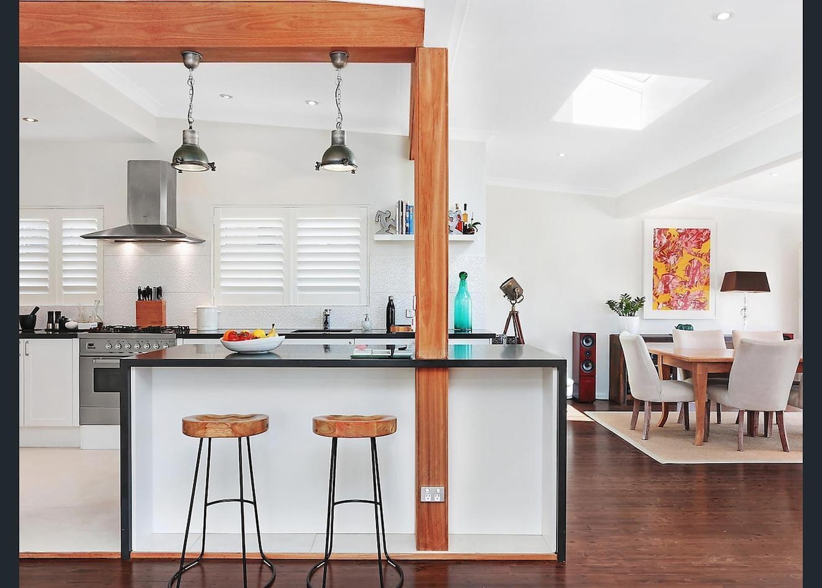Relaxa't i relaxa't a la nostra casa contemporània art déco. Un espai luxós i lluminós que ofereix tranquil·litat+ foguera de gas+jardí+aire lliure. Situat als pisos plens d'arbres, a només 500 metres a peu de les glorioses platges de sorra daurada i l'oceà blau clar que envolta Manly Beach. Un ambient costaner vibrant, un bullici cosmopolita, cafeteries especialitzades còmodament veïnes + mercats orgànics. A minuts del millor de Manly; manly wharf, relaxants passejades costaneres impressionants +parcs+ reserves marines + ferris manly+corso Precinct.