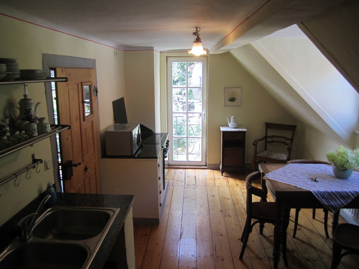 Amb vistes al bosc i al rierol. Pots sentir-te còmode davant de la llar de foc o fer servir el jardí amb sauna i estany. Hi ha molt d'espai per als hostes joves i grans. La proximitat de Rennsteign i directament al bosc i, al mateix temps, no gaire lluny del centre amb compres. L'apartament està moblat amb antiguitats, té una planta de taula, bany amb banyera i té una mida d'uns 90 metres quadrats. Àtic, no és accessible. A partir de 7 nits, l'ús de la sauna és gratuït.