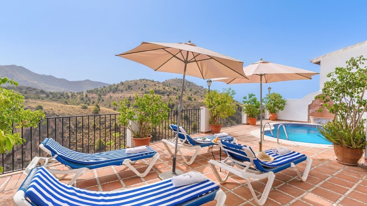 El que destaca d'aquest allotjament és la terrassa privada amb vistes panoràmiques i una piscina privada amb tumbones. L'apartament (60m²) és completament nou; perfecte per a una escapada romàntica per a dos. Disposa d'un dormitori, un bany i una cuina equipada. Des de la sala d'estar hi ha accés a una altra terrassa/balcó, des del qual es pot gaudir d'unes meravelloses vistes a la muntanya. Hi ha aparcament gratuït al carrer i està a només deu minuts a peu del centre de Frigiliana; Nerja està a 10 minuts amb cotxe.