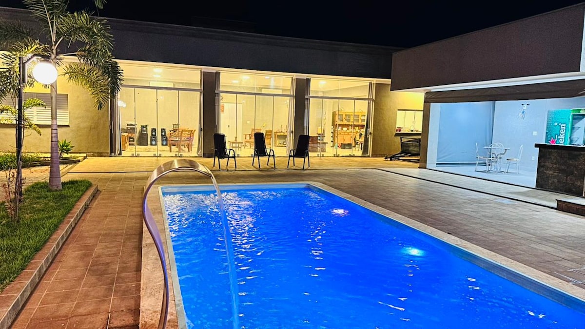 Rancho Novíssimo, a 500m do Clube Náutico Fronteira, localizado no Condomínio Reserva Rio Grande. - Acomoda 14 pessoas; - Piscina com hidro, led e cascata; - Internet Wi-Fi; - Sky (inclusive Premiere); - 3 quartos com ar condicionado; - 3 banheiros, sendo dois na área externa, e um na área interna. - Ampla área de lazer com churrasqueira para proporcionar diversão para toda família/amigos; - Condomínio possui rampa para acesso a barcos.