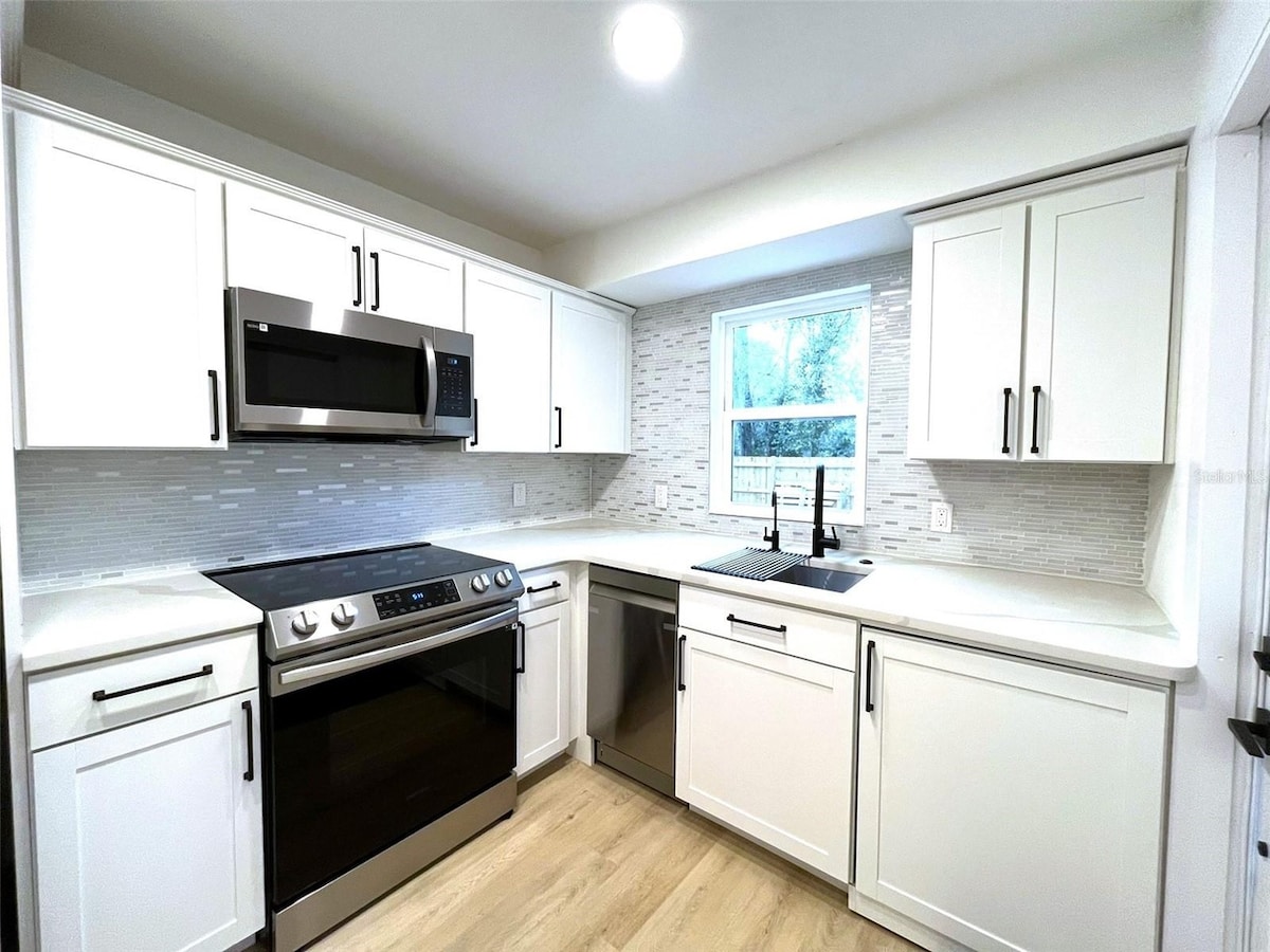 Adorable, tranquil, completament renovat 3/2 a prop de tots els serveis imaginables a The Villages i Hwy 441/27 a Fruitland Park/Lady Lake. Casa totalment remodelada situada en 1/3 acres amb un bonic pati tancat. Seu al porxo que hi ha a tocar de la porta de la cuina i gaudeix del cafè del matí. El pati del darrere també compta amb una foguera. Relaxa't! L'allotjament disposa de 2 llits «king size», 1 llit doble, un dormitori principal amb pica per a ell i per a ella, una televisió de 55 polzades a la sala d'estar, un espai d'oficina, una illa de cuina amb estris de cuina i una taula de menjador de 6 places amb cadires.