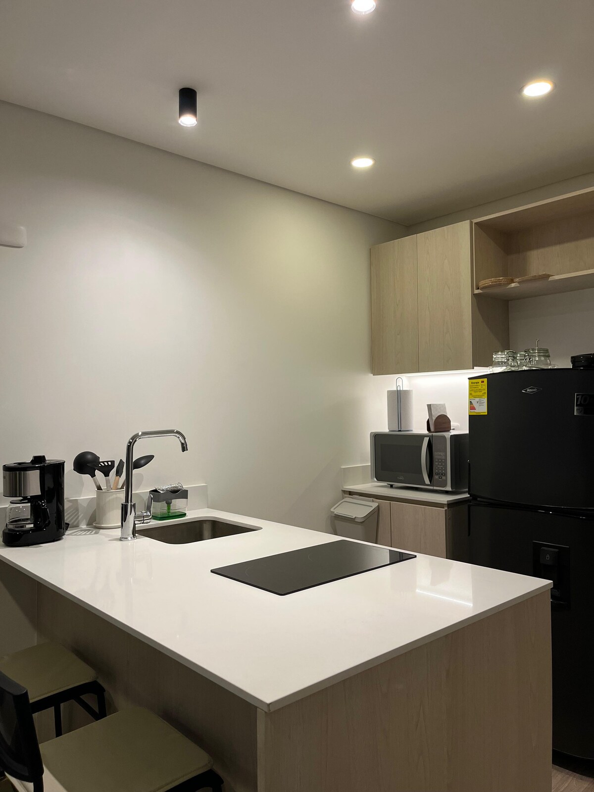 Preciosa apartaestudi amb un espai obert i lluminós amb vista exterior i un disseny excel·lent. Un llit extradoble còmode, un sofà llit i un bressol. Cuina totalment equipada. Connexió wifi d'alta velocitat (500M) Situat en una zona tranquil·la i segura a prop de Corferias, l'ambaixada americana, Movistar, l'aeroport i el transport públic. L'edifici té una bugaderia, una àmplia zona de cotreball i sales de reunions. Ideal per a parelles o famílies petites que busquen comoditat i estil.