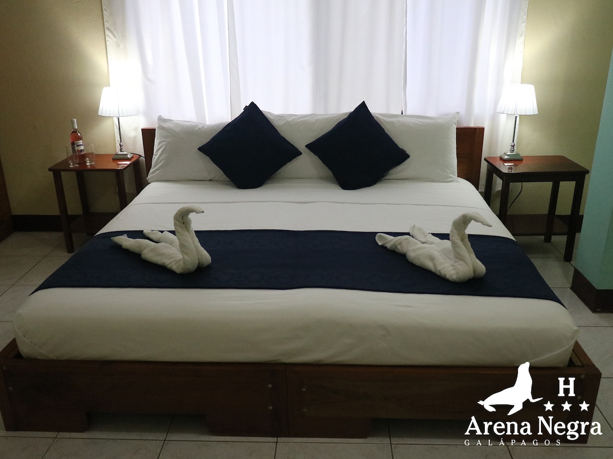 Habitació a la segona planta. L'habitació disposa de 2 llits "queen size", aire condicionat, bany privat amb aigua calenta i assecador de cabells. Després de les visites turístiques, gaudeix de la piscina. Oferim aigua filtrada, te i cafè de Galapagueño gratuïts les 24 hores, disponibles quan ho necessitis. Els nostres preus no inclouen el 15 % d'IVA. Si ets d'EQUADOR i necessites una factura, posa't en contacte amb nosaltres abans de confirmar la reserva.
