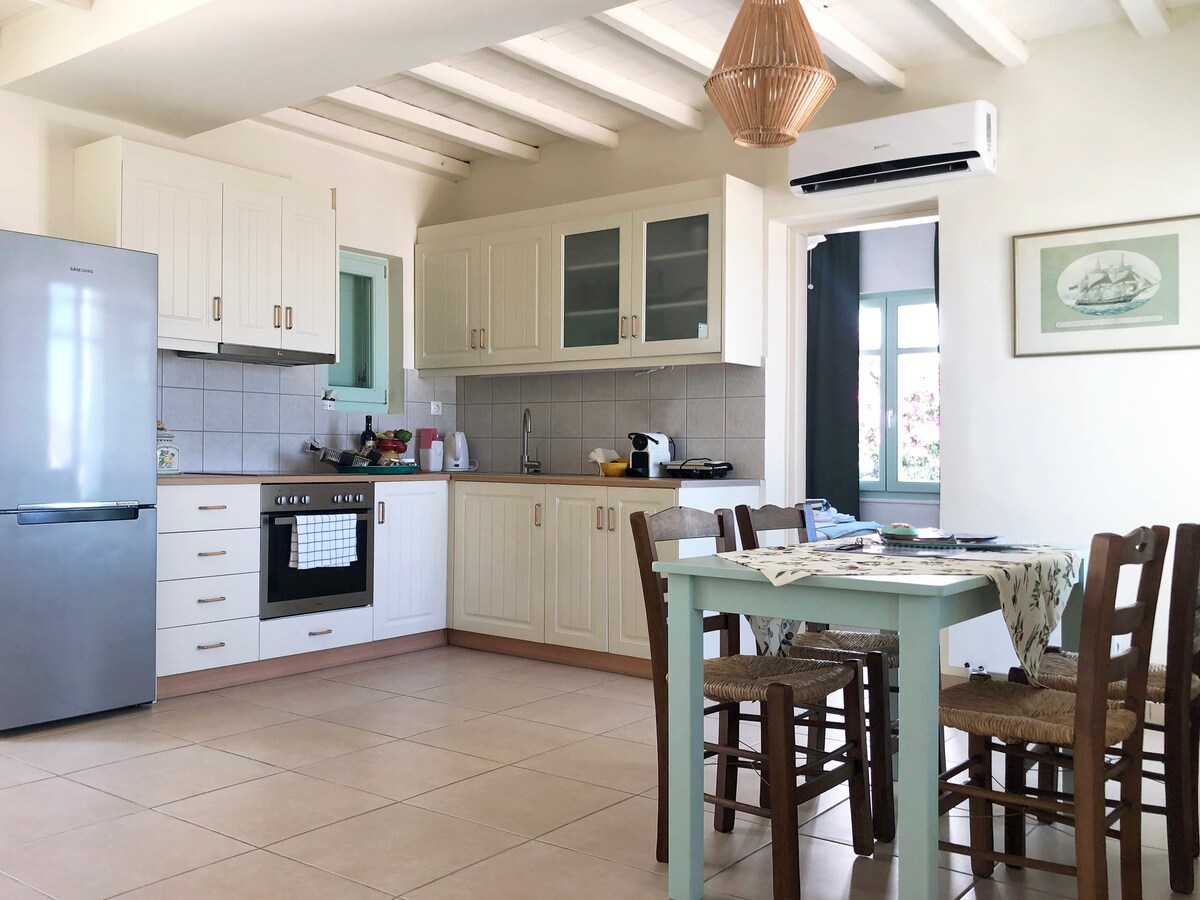 Pis d'un dormitori totalment equipat amb vistes frontals al mar. Un llit doble al dormitori i un sofà llit a la sala d'estar, cuina totalment equipada (forn, nevera-congelador, rentador de plats, 4 fosses), bany amb dutxa , rentadora, terrassa privada amb cadires i taula. Accés a un pati compartit amb accés directe al mar (roques) on els hostes poden banyar-se al matí. Vista frontal al mar des de l'habitació i el dormitori. A pocs passos del centre d'Ermòpolis.