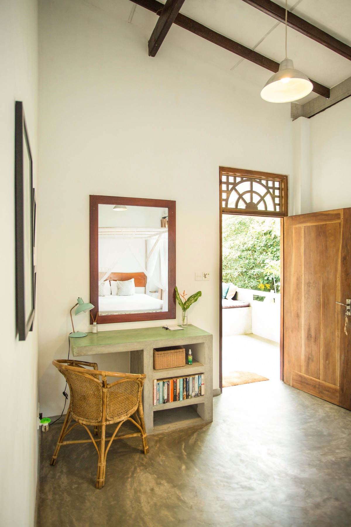 L'Estudi Verd és un amagatall espaiós amb un llit i tot el que necessites per a una estada perfecta a prop de la ciutat de Galle. Ideal i segur per a una dona que viatja sola. Les parelles són benvingudes, és clar. Com que és a només 15 minuts en Tuk Tuk del fort de Galle i a 10 minuts en cotxe de la platja d'Unawatuna, és el lloc perfecte per estar. Els hostes tenen accés al jardí, a la piscina, al pavelló per dormir, al pavelló de ioga, al petit spa i a la piscina. Per a una privacitat total, tenen el seu propi balcó amb vistes al jardí.