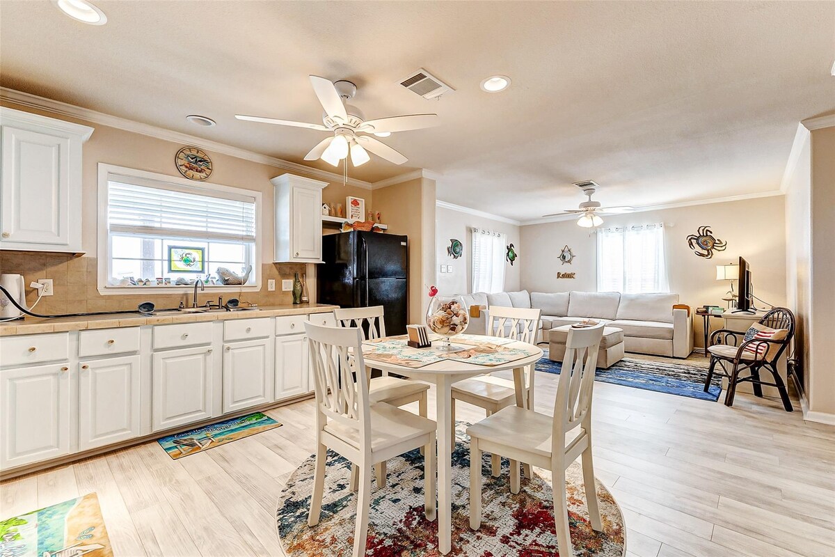 Impressionants albes i postes de sol des de les dues cobertes. Bany complet per a cada dormitori. A pocs minuts a peu de la platja, on pots prendre el sol a la platja expansiva, poc profunda per als més petits, fer volar estels de mida Texas, agafar-te de les mans caminant per la platja recollint petxines o veure els pelicans volar. Enamora't de l'impressionant cuina de rajoles de color blau oceànic amb vistes a les finestres completes o graella al paradís de la planta baixa amb jocs familiars. 🌴 Botiga i restaurant locals a menys de 5 minuts. Reserva amb antelació i estalvia! No hi ha llits per fer!