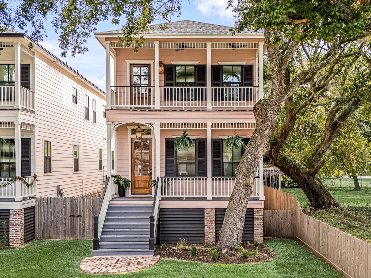 -Casita de Palmera: Relaxa't a la terrassa il·luminada i coberta de palapa amb el teu cafè o còctel. Apte per a famílies i animals de companyia! A menys de 800 metres de la zona històrica del centre de Galveston i a 4 minuts en cotxe de la platja. A prop de tota la diversió, compres, música en directe i restaurants de The Strand! - Pati posterior tancat -800+ MBPS WIFI -4 televisors intel·ligents amb capacitat Roku per transmetre amb els teus comptes. -Arcade i jocs de taula - Graella de bany - Tovalloles i joguines de platja a prop de les terminals de creuers i a UNA cuadra de l'aparcament de creuers.