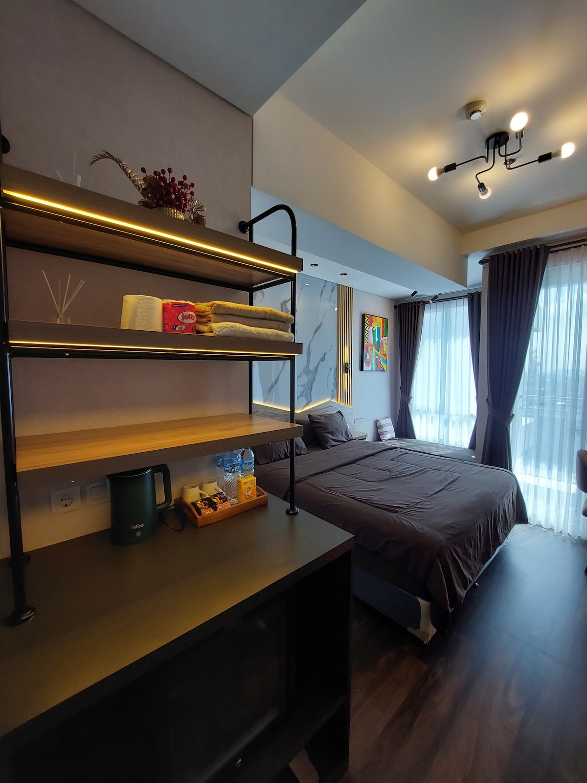 Et donem la benvinguda al nostre encantador pis de dos dormitoris situat a l'allotjament cèntric a prop de la zona de SCBD i Sudirman. El meu espai ofereix unes vistes impressionants de la ciutat, una cuina totalment equipada i una sala d'estar còmoda i elegant perfecta per relaxar-se després d'un dia d'exploració. Gaudeix d'un fàcil accés a tot, des del districte de negocis fins als millors centres comercials i la vida nocturna de Jakarta. L'apartament també inclou WIFI d'alta velocitat, televisors intel·ligents amb serveis de streaming i una zona de lectura acollidora.