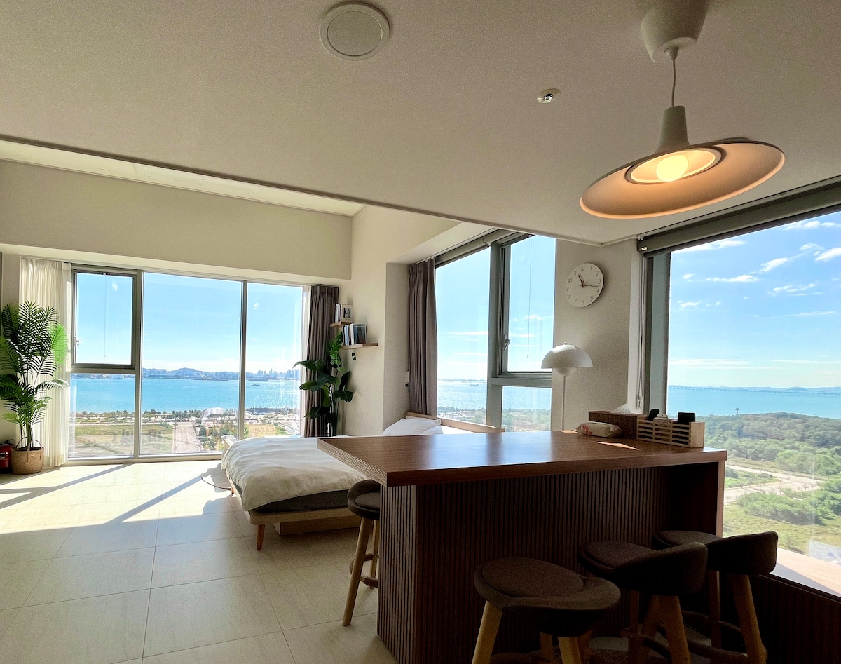 Vista a l'oceà de Young Jongdo Pool · Smart TV de 65 polzades · OTT gratuït · Sortida tardana · Allotjament net i ordenat · Altaveus Marshall
