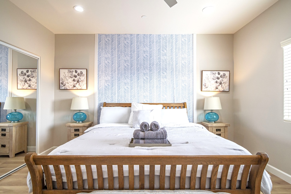 Situada al comtat d'Orange, aquesta casa de luxe moderna de 2 plantes de nova construcció ofereix 3 dormitoris, 3 banys i una barreja de comoditat i elegància. Relaxa't al nostre elegant allotjament amb fàcil accés a les atraccions locals de SoCal. Passa l'estona al balcó o en una de les 2 sales d'estar, o gaudeix d'un àpat casolà a la cuina totalment equipada. Gaudeix de parcs temàtics, senderisme, compres, restaurants exquisits i platges precioses. Descobreix el comtat d'Orange amb nosaltres! Auns15 minuts del parc i les platges de Disneyland