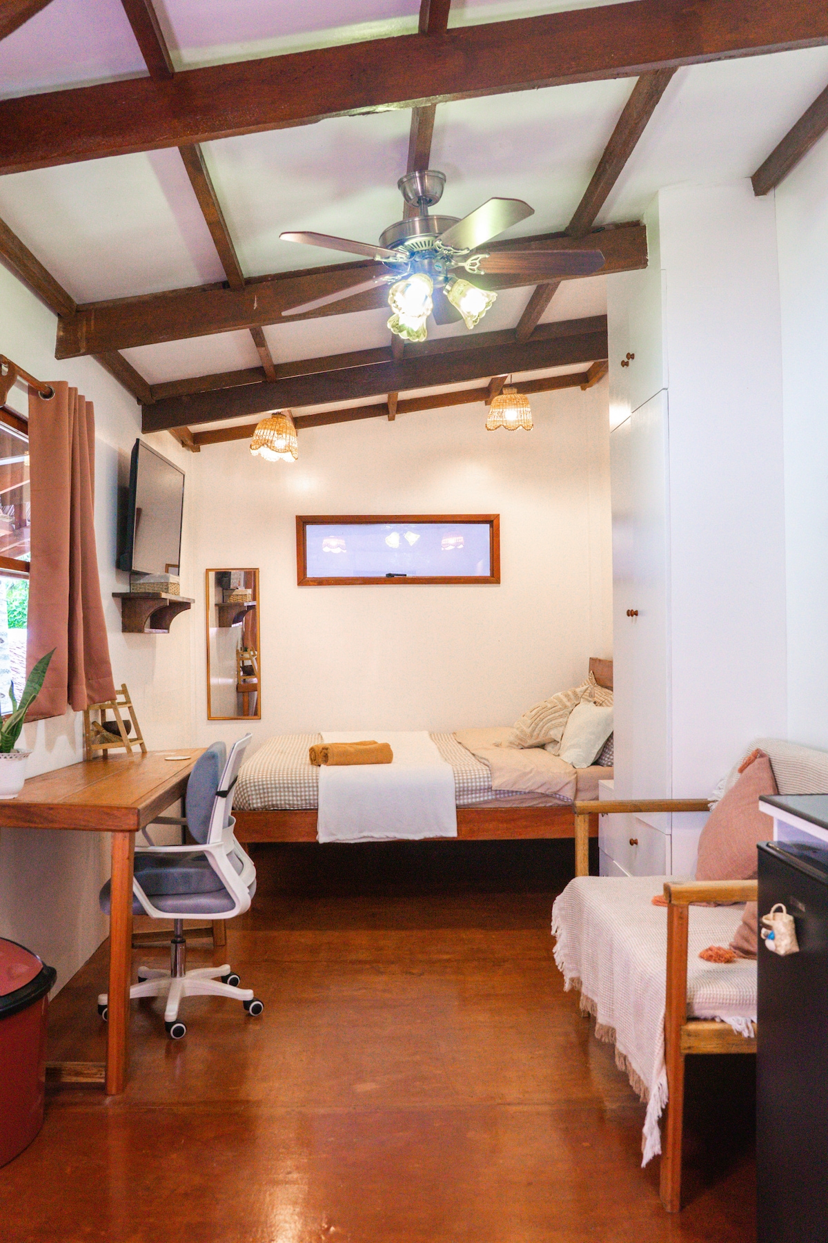 Brand new apartment ideal for digital nomads. located in a peaceful yet central residential area - within 10 minutes walk to Cloud 9 and AFAM bridge, and 10 minutes by tricycle into the heart of General Luna. The room has a queen bed with comfy mattress and duvet, fast Starlink WiFi, Smart TV, AC, large bathroom with hot shower, kitchen with utensils, fridge, working desk and office chair, and private veranda. We have two units available, this listing is for the upstairs room (first floor).