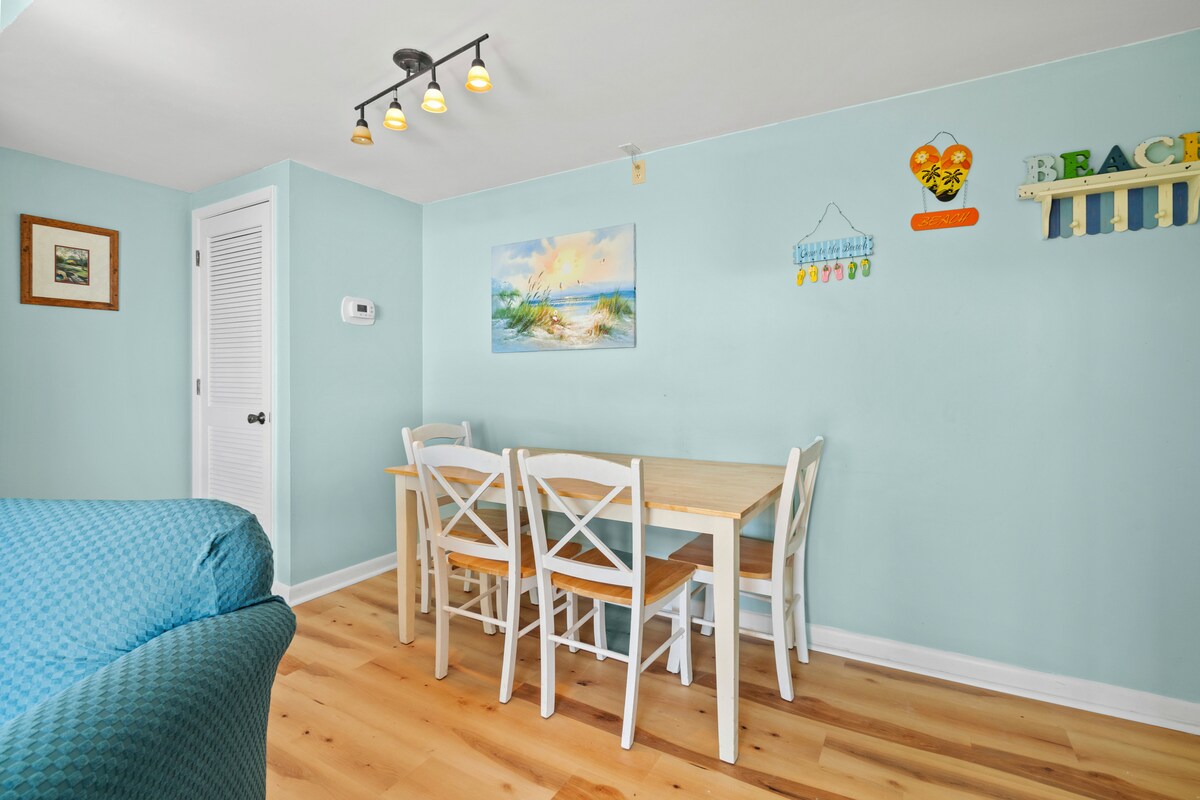 El nostre apartament està situat a la secció davantera de l'edifici "A". Aquest apartament té un llit «KING size» al màster amb un bany privat de mida completa, llits individuals al segon dormitori i un sofà llit «queen size» a la sala d'estar. També hi ha un altre bany complet . Estem ubicats en un complex hoteler davant de l'oceà de 33 hectàrees amb 6 piscines a la frontera de Surfside, a l'extrem sud de Myrtle Beach. També tenim seguretat les 24 hores per als nostres hostes. El nostre complex hoteler és un complex hoteler molt familiar. Riu lent, piscina climatitzada. Jocs a l'aire lliure!