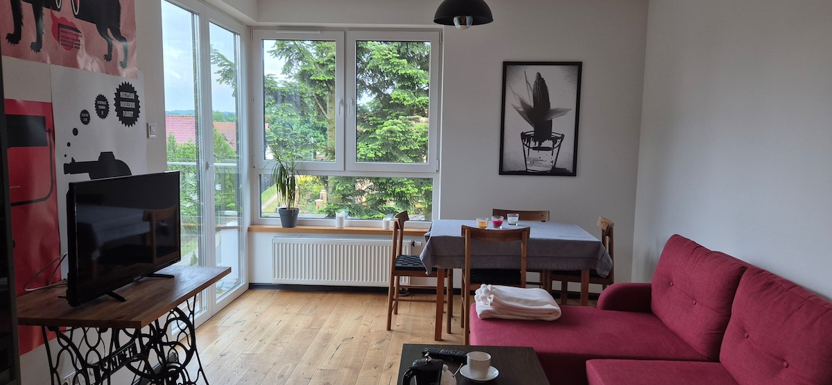 Et convido a un apartament modern, que es troba en una zona verda i tranquil·la, a les afores del centre de la ciutat. És el lloc perfecte per a aquells que busquen una mica de tranquil·litat i relaxació després d'un intens dia de visites turístiques. Arribar al centre de la ciutat i a l'estació principal de tren és ràpid i fàcil: només necessites 11 minuts en tren ràpid des de la parada de Cracòvia Zakliki. Si viatges en avió, aquest pis és l'opció perfecta per a tu (transport a uns 7 minuts en tren, uns 10 minuts en cotxe).
