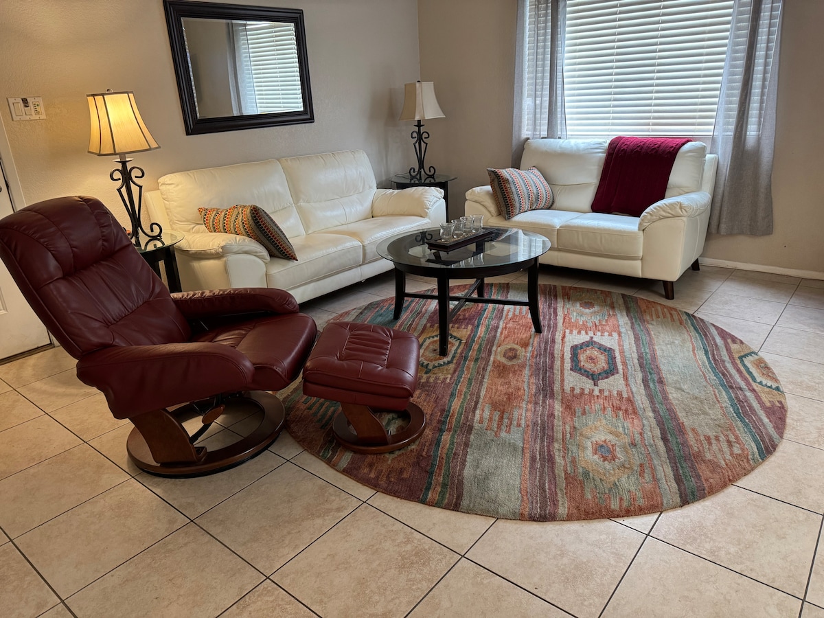 Casa d'hostes tranquil·la i espaiosa d'una sola planta a la zona del desert. Entrada privada i garatge. Boniques postes de sol, llums de la ciutat, a prop de molts camps de golf a East Valley i l'autopista al centre de Phoenix està a minuts. Perfecte per a visitants d'hivern, excursionistes, aficionats a l'entrenament de primavera o qualsevol persona que vulgui gaudir del que pot oferir-te Phoenix!