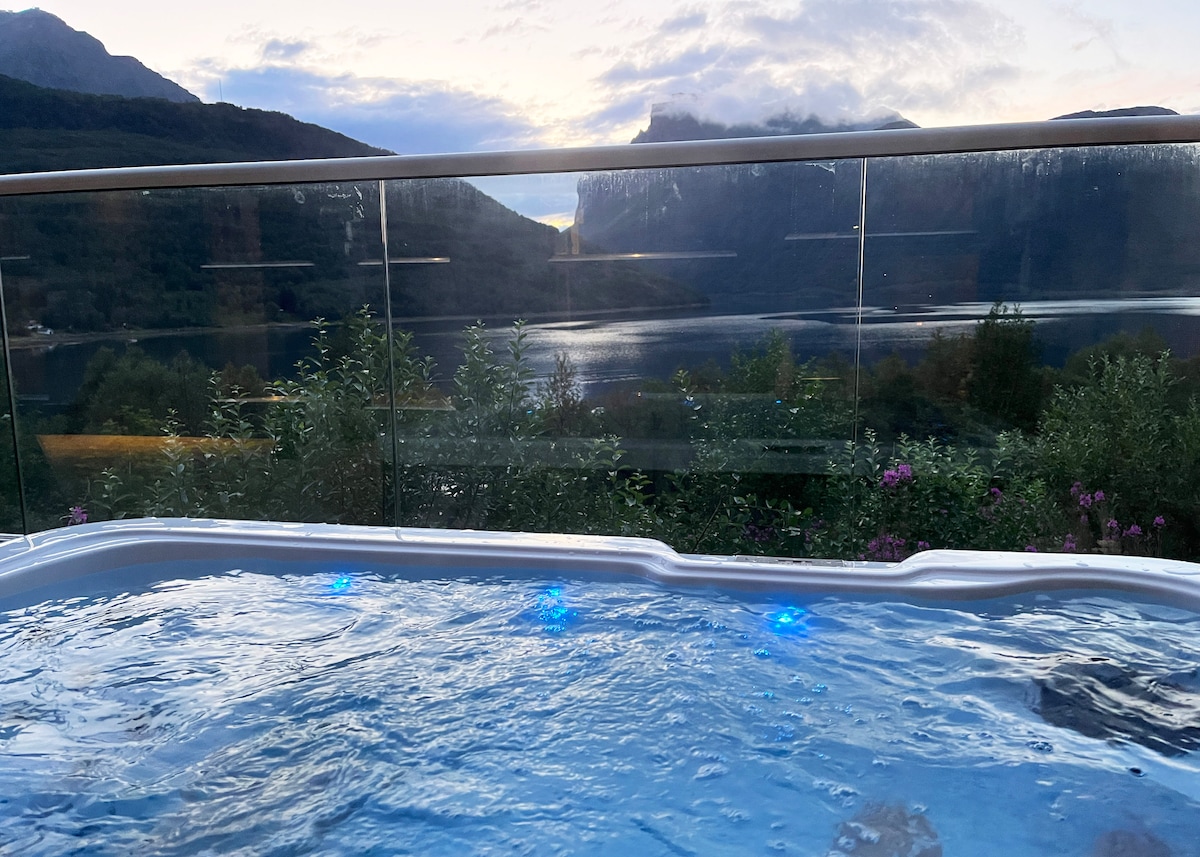 Romslig hytte med jacuzzi og hav‑ og fjellutsikt
