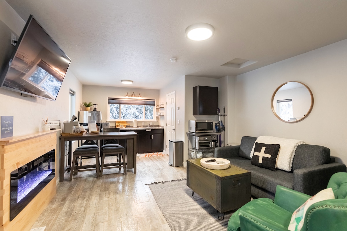 Elegant apartament tipus estudi, concepte obert (sense dormitori separat: llit «king size» i sofà llit) perfecte per a una parella (o una família petita), situat a 2 minuts a peu del telesilla a la base d'Alyeska. Aquest apartament té tot el que necessites per cuinar menjars complets, treballar a distància i descansar després d'un dia difícil d'activitats a l'aire lliure.