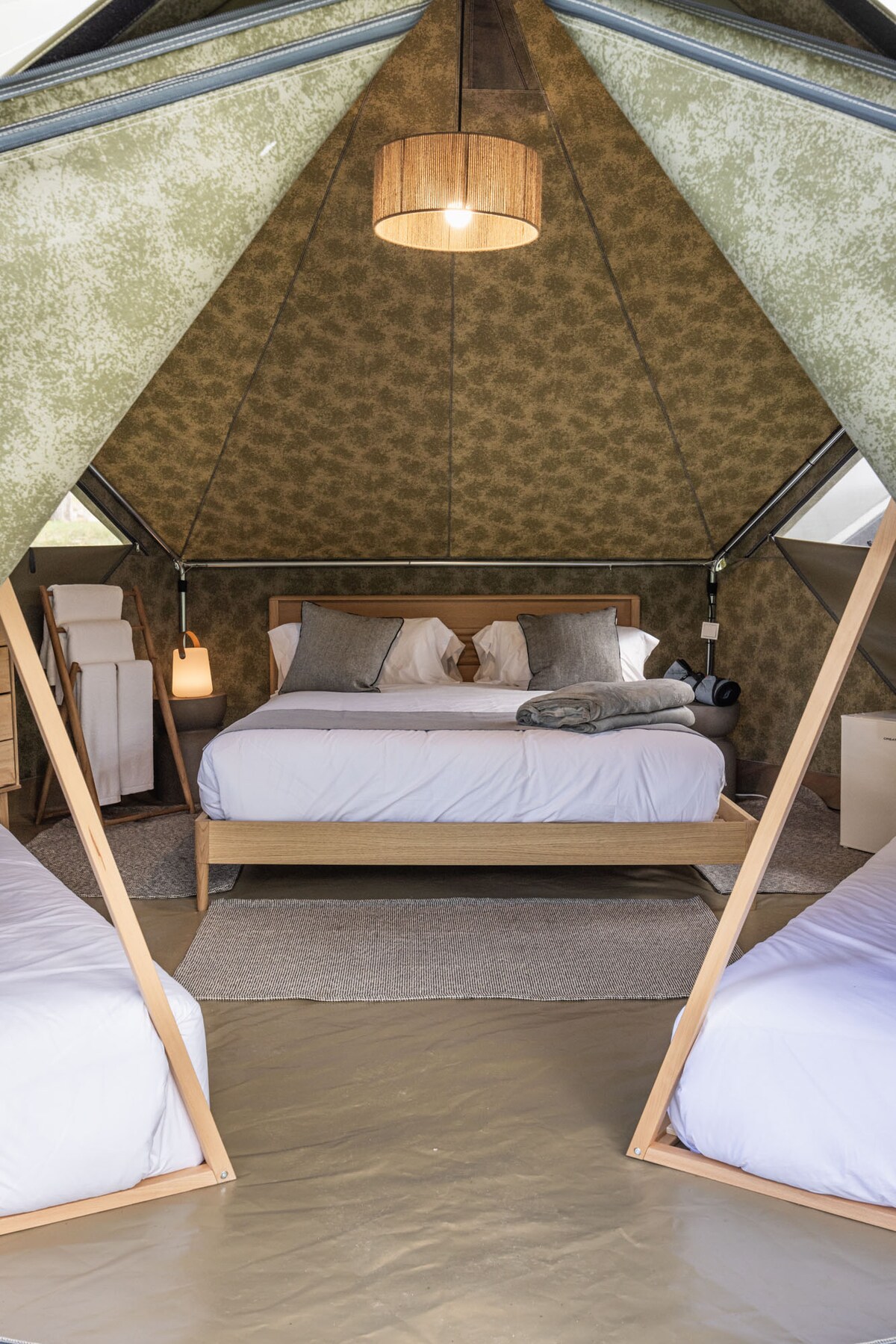 Tendes de glamping situades a la part mitjana-alta del complex. Capacitat per a 4 persones. Disposen de dues habitacions, una amb llit doble (150x200) i una altra amb llitera amb llits individuals (80x200); cuina equipada. Terrassa coberta amb sofà i taula de fusta de pícnic. No hi ha bany, però hi ha aigua corrent. S'han d'utilitzar els banys i dutxes de la zona comuna del càmping. Els llençols i les tovalloles no estan inclosos (oferim un servei de lloguer). No s'admeten animals de companyia