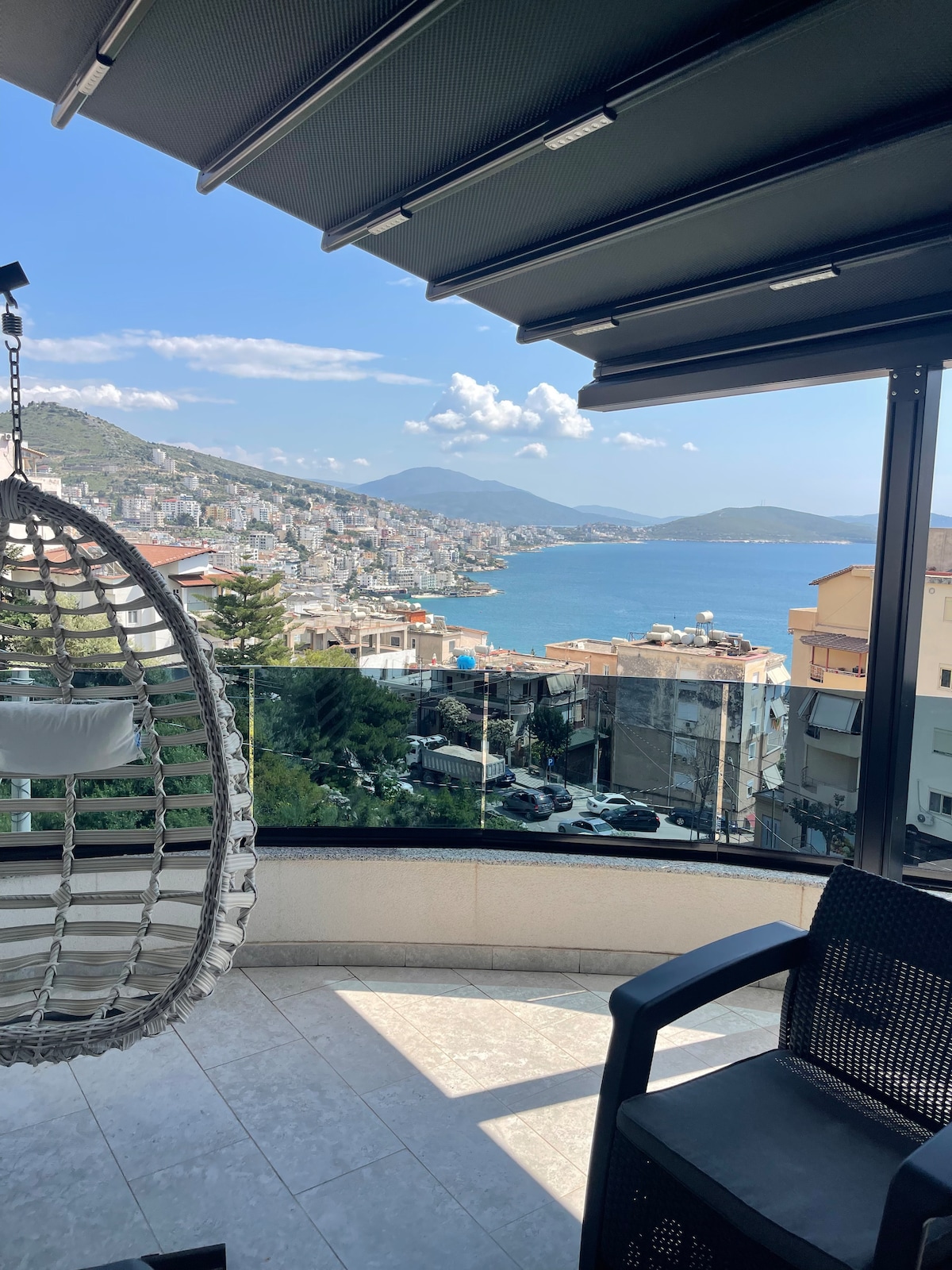 Aquest pis tipus loft ofereix una experiència única a Saranda. L'espai té una arquitectura moderna i una vista de 180 graus del mar Jònic.