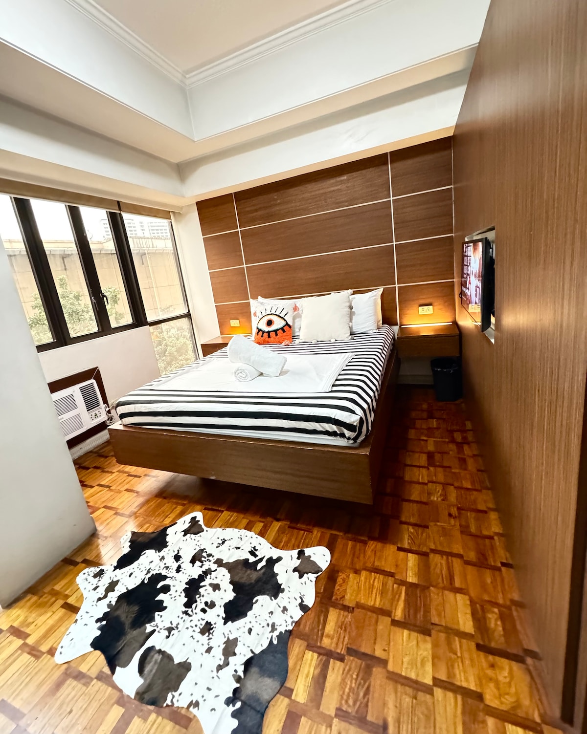 Obre el vi de cortesia i escolta música a través d'altaveus retro Marshall. Aquí els mobles de fusta personalitzats es troben amb parets de formigó texturitzat, les catifes perses de luxe, les peces vintage clàssiques i els detalls artístics pop dels anys 60. Una fusió refinada de característiques industrials i retro donen a aquest loft el seu caràcter únic i especial. Perfecte per a un ambient d'hotel d'art boutique fotogènic. Una opció fantàstica per a viatges de negocis i parelles amb gustos exigents, que busquen allotjar-se en una de les ubicacions més importants de Manila.