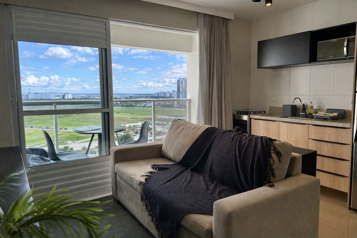 Pis nou. ❗️Un apartament únic, elegant i sofisticat, fet per fer-te sentir com a casa. Mira la teva pel·lícula preferida a l'habitació o a la sala d'estar amb un televisor giratori amb canals oberts i aire condicionat a l'habitació. Descansa en un llit «queen size» i gaudeix de les vistes des de l'ampli balcó del jardí i d'una bonica posta de sol al Setor Bueno contemporani, a la millor zona de Goiânia! Condomínio Tai Residências