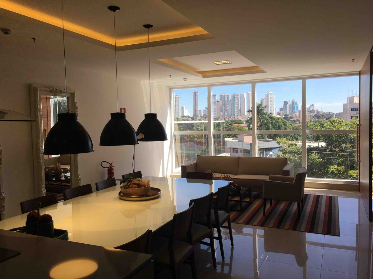 ❗️Un nou apartament únic, elegant i🤩 sofisticat, fet que et sentis com a casa. Mira la teva pel·lícula preferida al dormitori o a la sala d'estar a la televisió intel·ligent més moderna amb aire condicionat, taula de menjador i espai de treball. Descansa al millor llit, gaudeix de la dutxa més deliciosa, gaudeix del balcó i d'una preciosa posta de sol amb vistes al parc i gaudeix del Setor Bueno contemporani a la millor regió de Goiânia . Condomínio Tai Residências