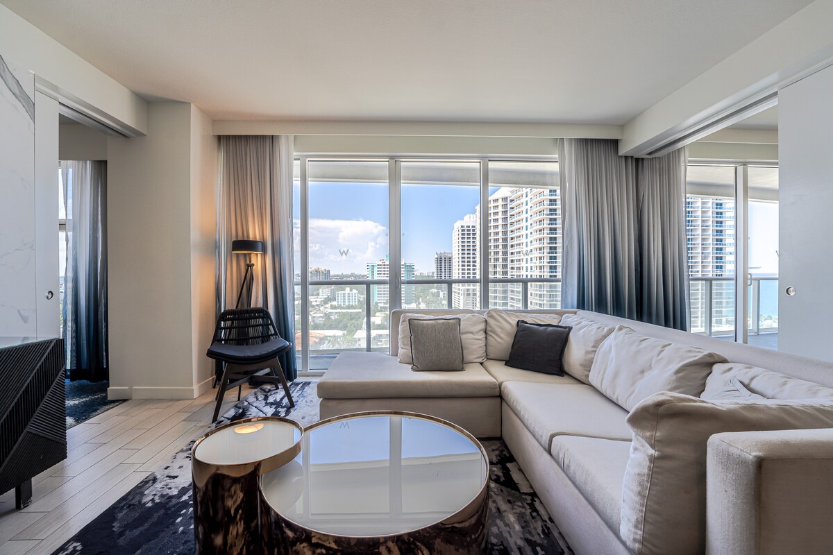 Pis de luxe al 12è pis a la Residència W. Totalment moblada, 2 dormitoris/2 banys amb vistes panoràmiques de 180° de la ciutat i de l'Intracoastal, a més d'una bonica vista lateral de l'oceà des del balcó i la sala d'estar. Cuina moderna amb electrodomèstics de primera qualitat, rentadora i assecadora a l'allotjament. Serveis d'estil resort: servei a la platja, piscines, jacuzzi, spa, gimnàs i bar a la sala d'estar. Sopa a Steak 954, El Vez i Sobe Vegan, a només un ascensor de distància. A prop de W Water Taxi, botigues, vida nocturna i la platja.
