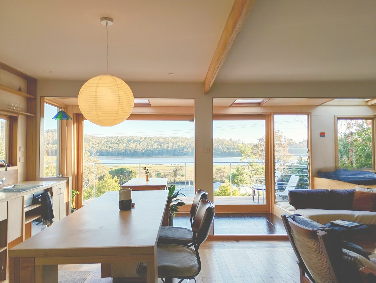 'The Edge' is situated in Binalong Bay, right in the heart of the stunning Bay of Fires conservation area on Tasmania's East coast. A quiet peaceful retreat, it sits right on the edge of the tranquil Grants lagoon and a lovely lagoon-side walk takes you to the beaches the area is famous for. The open plan space is warm and bright, receiving all day sun. Beautiful views over the water and surrounded by a large sundeck and a semi tropical garden - The Edge is a perfect place to relax and unwind.