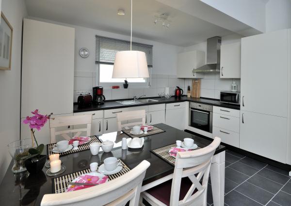 L'apartament de dos dormitoris, un dormitori per a nadons amb bressol, una cuina totalment equipada (estufa, microones, cafetera, rentaplats, bullidor) i un bany es troba al costat sud tranquil, al soterrani d'una casa de dues famílies. L'esmorzar es pot gaudir en una terrassa amb vistes al jardí. Està a només uns 150 metres de la platja de sorra fina.
