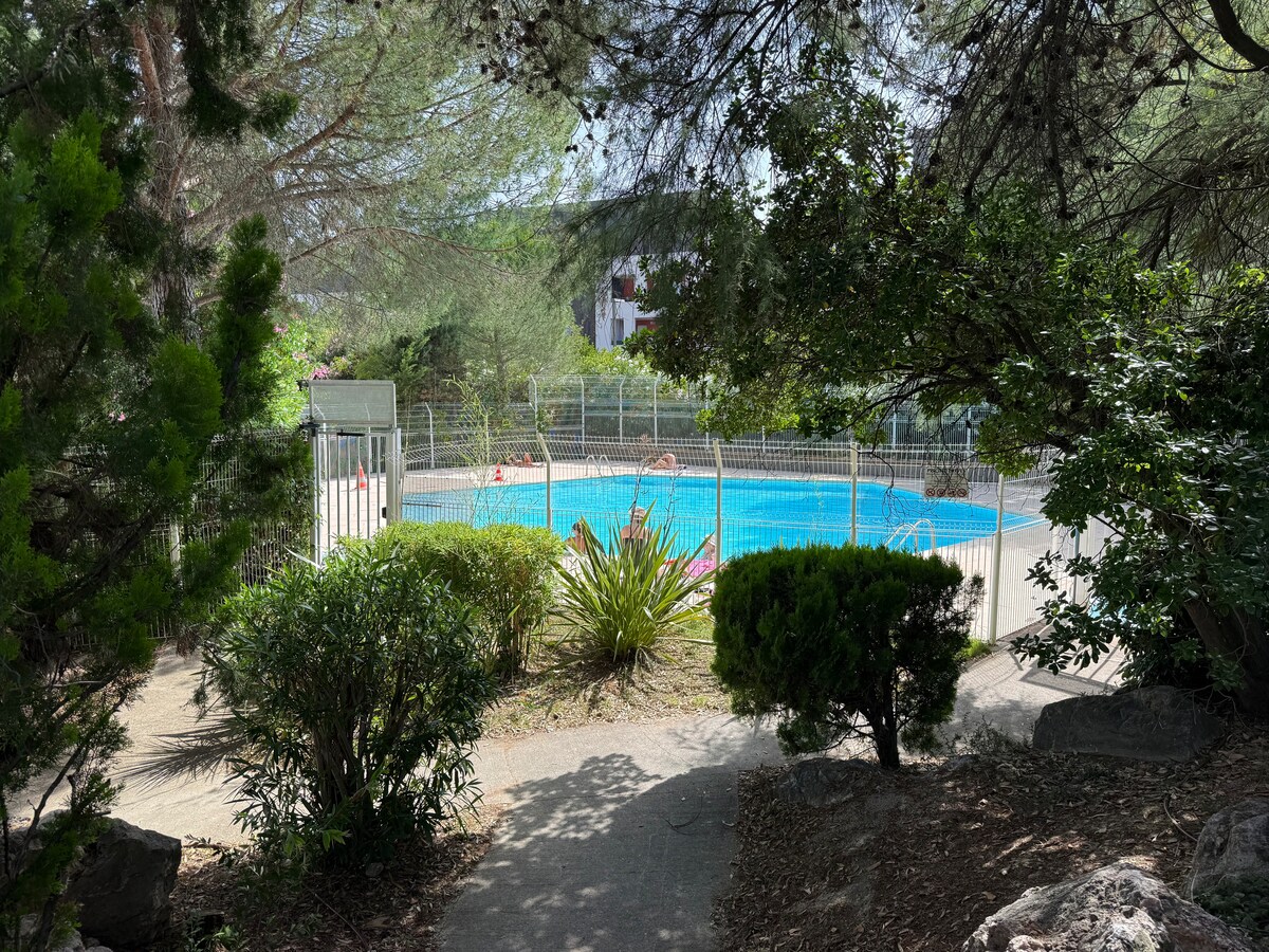 Et donem la benvinguda al teu refugi tranquil al sol! Aquest encantador estudi per a dues persones, situat a Grabels, a menys de 5 minuts de Montpeller, és el lloc perfecte per a una escapada relaxant al sud de França. Aquest allotjament acollidor, situat en una residència tranquil·la amb piscina, et dona la benvinguda en un ambient natural i relaxant. L'estudi, decorat amb bon gust en fusta, tons blancs i verds, combina encant, comoditat i funcionalitat.