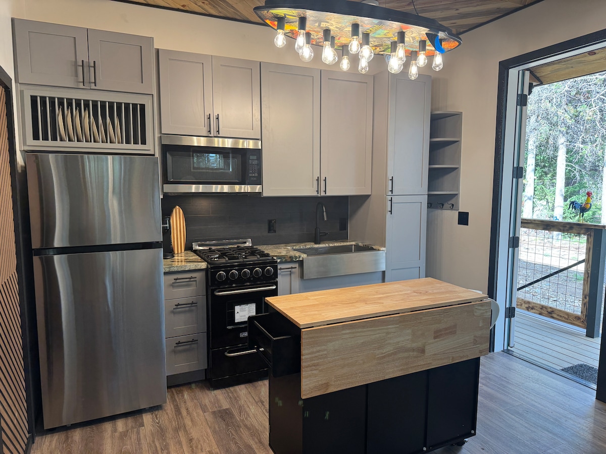 Retreat to the fire pit of your opulent healing farm cabin with your own giant round hobbit window facing sunset & gaze at the twinkling night sky, majestic views or play with the goats. Only 7 min from town, come rest, play and heal in your private cabin with all the comforts of a clawfoot tub, walk-in rain shower, full kitchen with Italian farm sink, high-speed wifi, large flatscreen smart tv, king size bed, twin pull out couch and art from your hosts.
