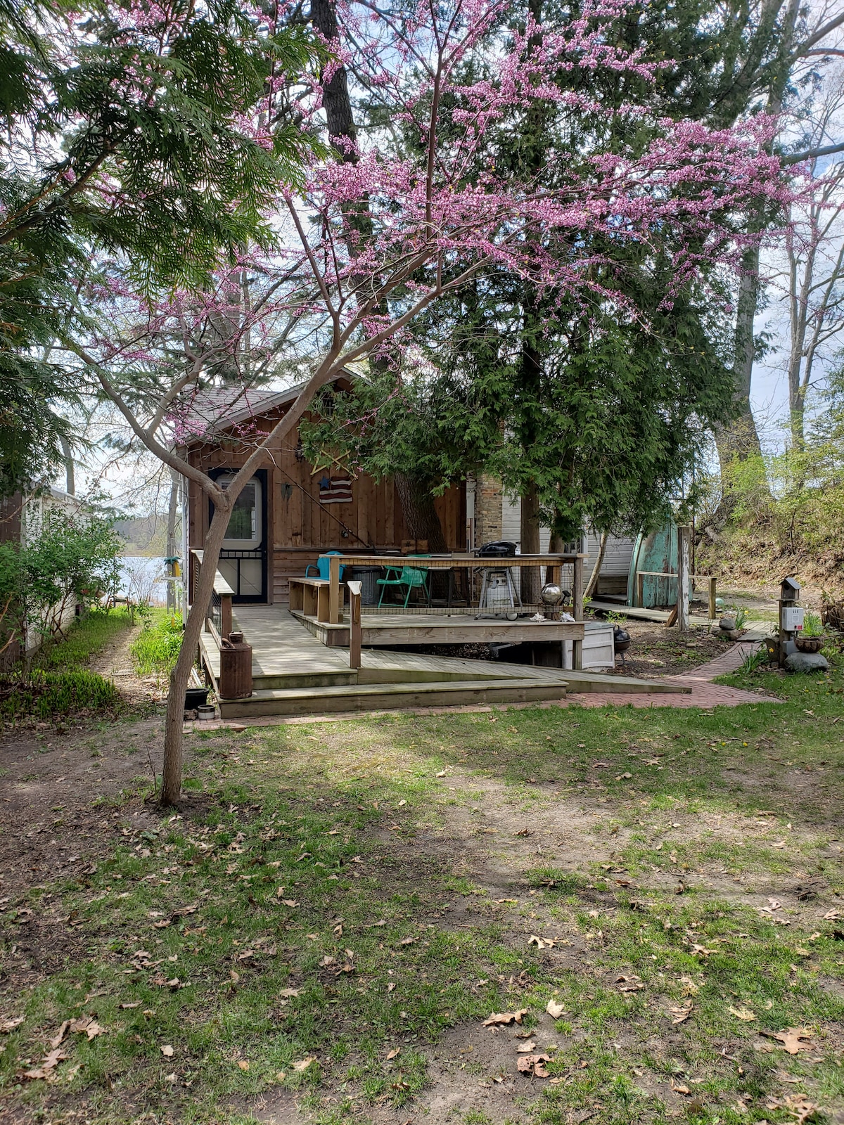 Experience private lakeside glamping in a tiny home on Park Lake. (View of lake during winter only or upstairs due to cattail/or by path)This tiny house on our property comes with *outdoor* composting toilet, pump shower & pump sink. We provide filtered water, coffee, snacks, WiFi, 48hr cooler, dvds. rechargeable fans , lantern, s’mores, games, space for a tent. Ac/heat. * Newly added fenced in area for your pup 🐶 ONLY instant coffee provided - -NO Coffeemaker