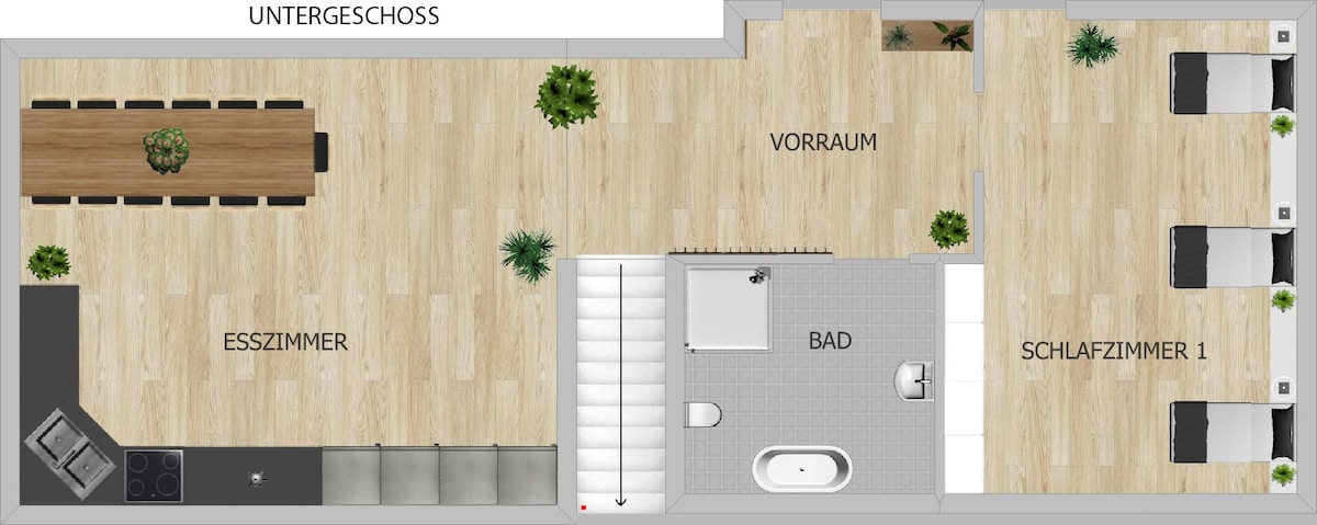 La casa és tranquil·la i està envoltada de natura, però a només 7 minuts en cotxe del centre de la ciutat. Consta d'una gran sala d'estar i cuina, entrada i bany a la planta baixa, un dormitori principal, un segon dormitori (amb llitera per a nens, però també utilitzable per adults) i bany a la segona planta. També hi ha un altre dormitori amb sauna d'infrarojos i bany al soterrani. La millor part, però, són el jardí amb terrassa, foguera, llit elàstic, el balcó i la gran terrassa que hi ha als turons de Graz.