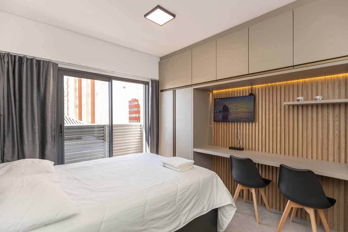 Estudi modern, nou, acollidor, ubicació perfecta, amb una vista preciosa des del balcó, especialment de nit . Wifi ràpida, escriptori, televisor intel·ligent de 55 polzades, llit «queen size». Aire condicionat (fred/calor). Rentadora i assecadora i una illa preciosa a la cuina. 50 m2 d'estil molt 27, tranquil. Al centre/Batel, a prop de botigues, bancs, centres comercials, centre gastronòmic i Hospital . A l'edifici :piscina, gimnàs, sala de jocs, sauna, jacuzzi, conserge les 24 hores.