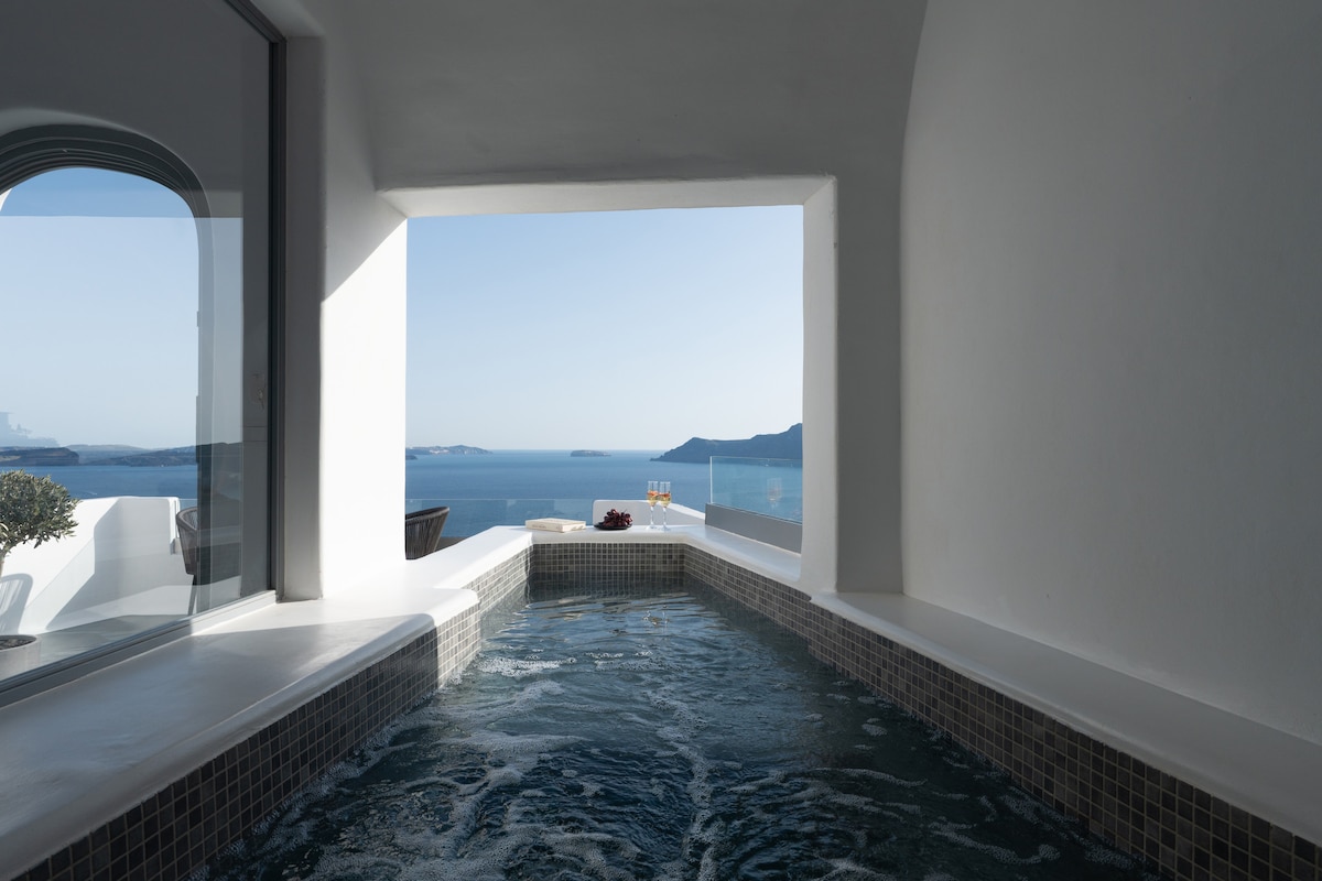 Et donem la benvinguda a la suite Èther, on l'ànima de Santorini es troba amb la poesia del cel de l'Egeu. Amagada entre els penya-segats emblanquinats d'Oia, la nostra suite de somni et convida a endinsar-te en un món de calma, bellesa i llum. Cada racó està impregnat d'elegància de les Cíclades, amb línies corbes, textures suaus i una sensació de serenitat que sembla atemporal. Un lloc perfecte per a parelles i llunes de mel!