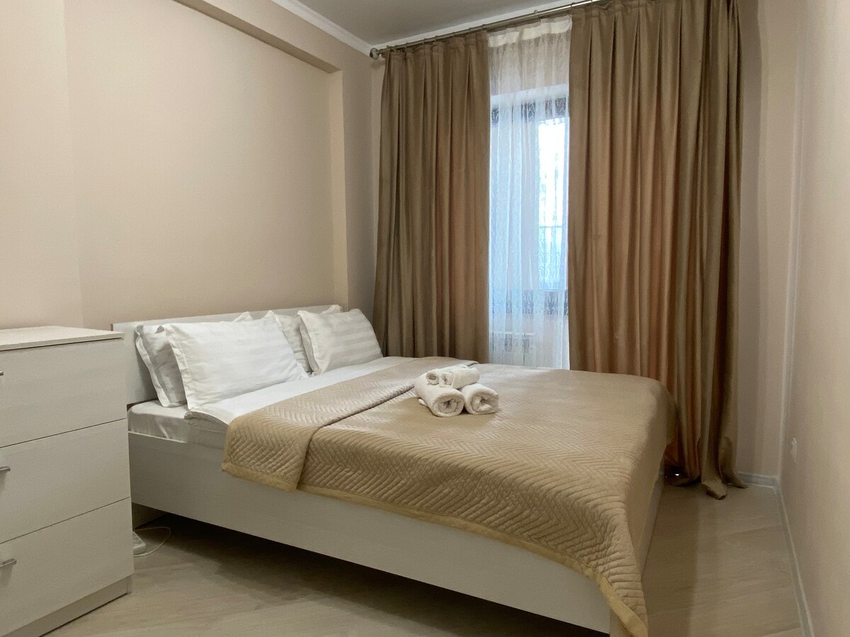 Un pis modern i elegant és una opció fantàstica per a viatges d'oci i de negocis. Situat al centre d'Almaty, a 100 m del carrer Abaya. A prop hi ha el circ, el Palau Esportiu, el Palau de la República, l'estadi central, el funicular, el teatre Lermontov, el teatre Mukhtar Auezov. L'estudi està totalment equipat per a 2 persones: un sofà, un llit doble, una zona de cuina amb els electrodomèstics necessaris, un bany, un televisor gran i wifi d'alta velocitat. Finestres amb vistes a la muntanya i un pati tranquil.